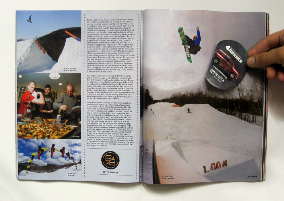 We created custom stickers for Snowboarder and Surfer Magazine. 4Runner was integrated into content by covering editorial photgraphy. Once the sticker was pulled from the page the action shot underneath was revealed. A series of these culminated in an ad created solely for each magazine.