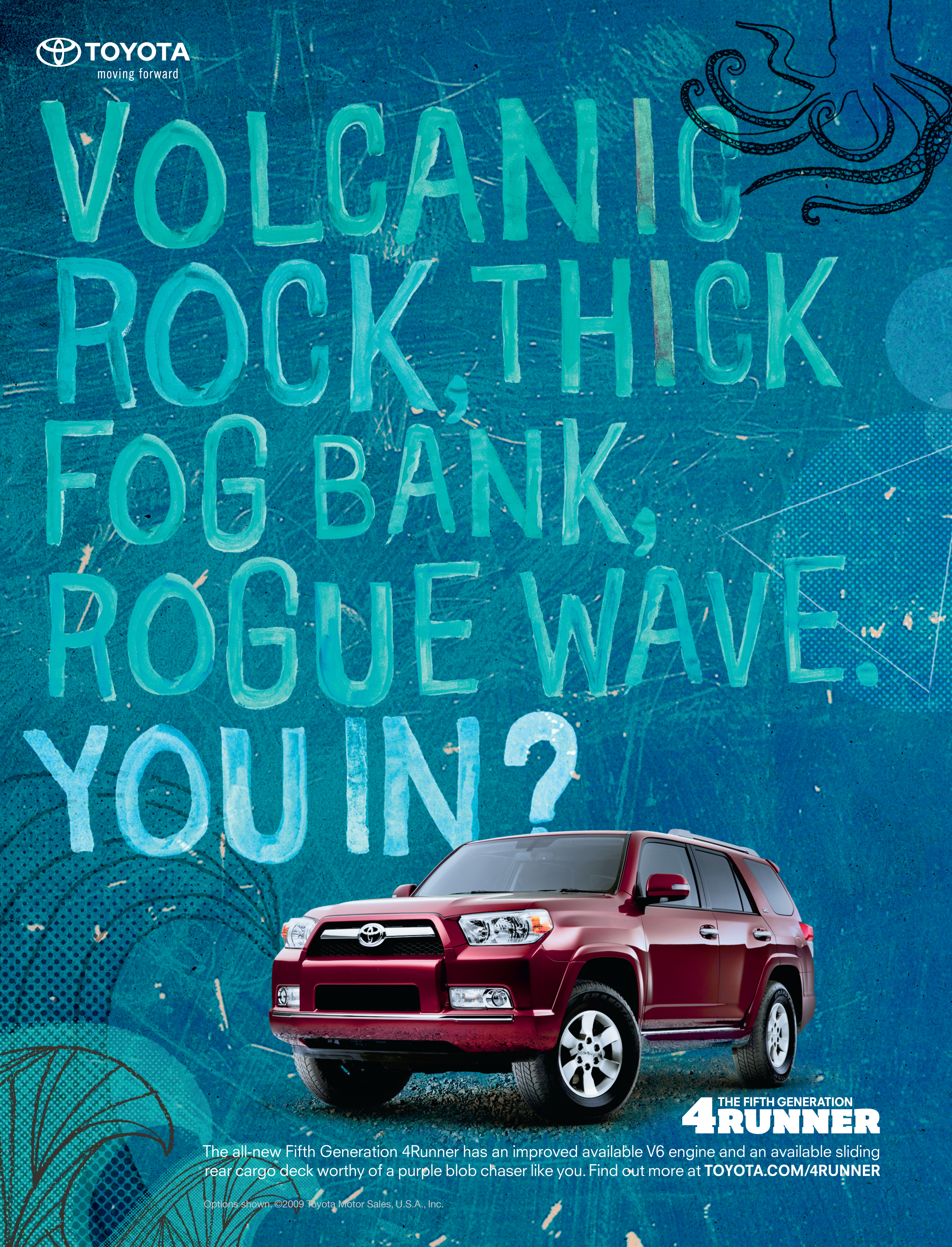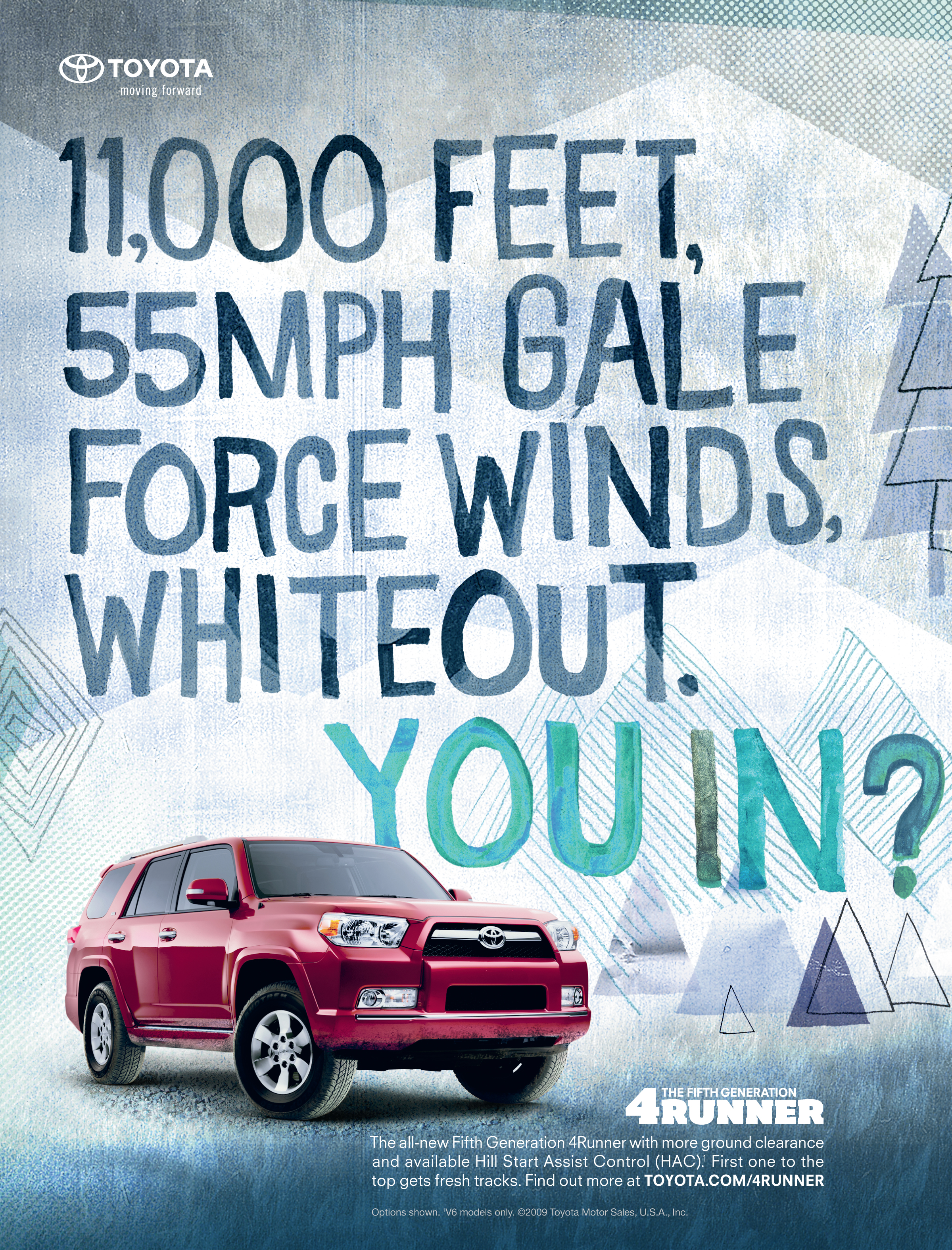 Each medium introduces elements that a person might encounter on an adventure in the 4Runner and push the boundaries of the outdoor adventure epitomized in the 4Runner lifestyle.
